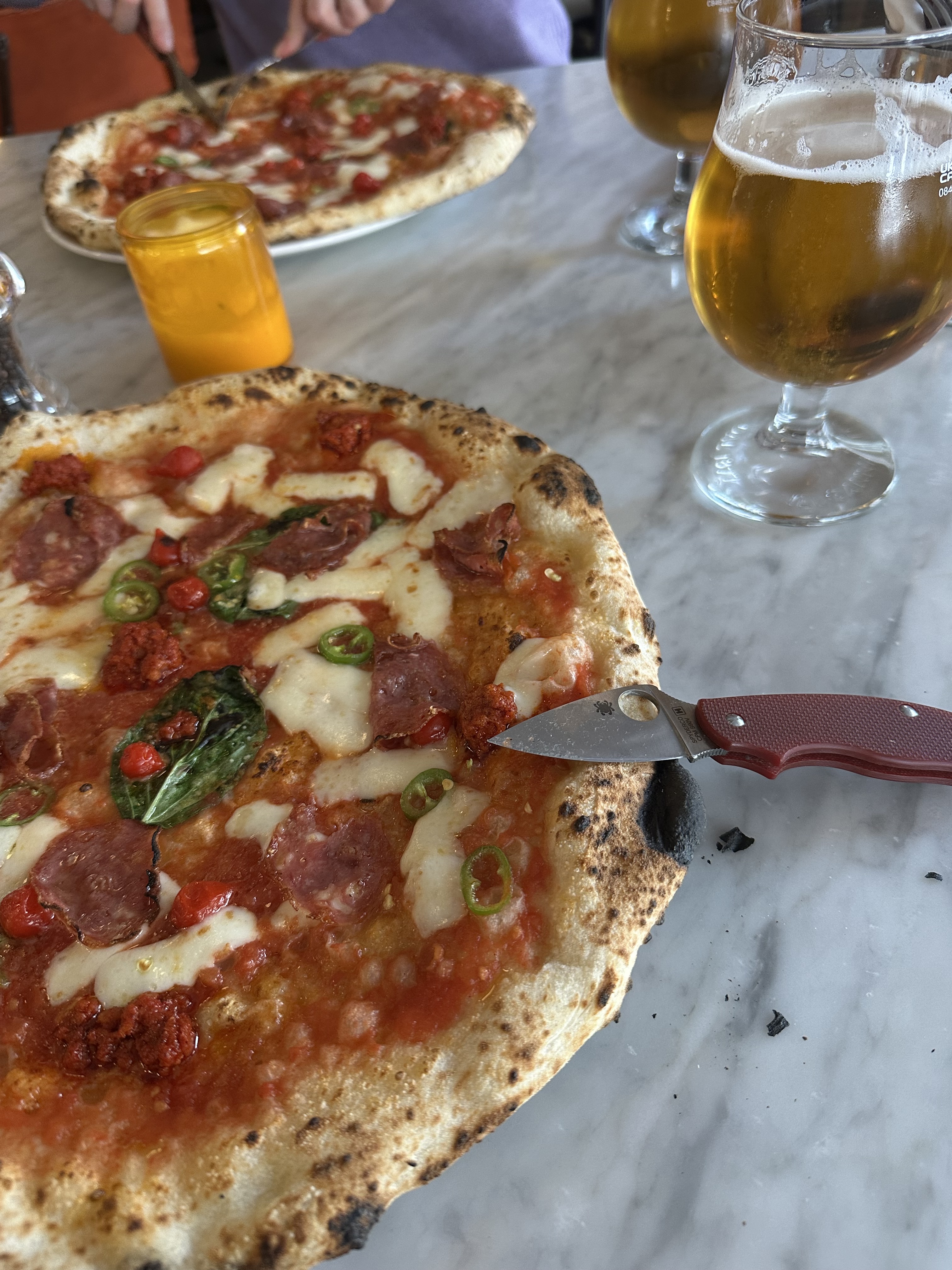 I didn’t bring any sharpening stone to touch up the edge, but I found that mostly the tip was the part coming into contact with the ceramic. With longer blades, I usually tilt the knife slightly to avoid any 90° cuts against the plate. But with the Squeak, I just went at my pizza like a hungry wolf.