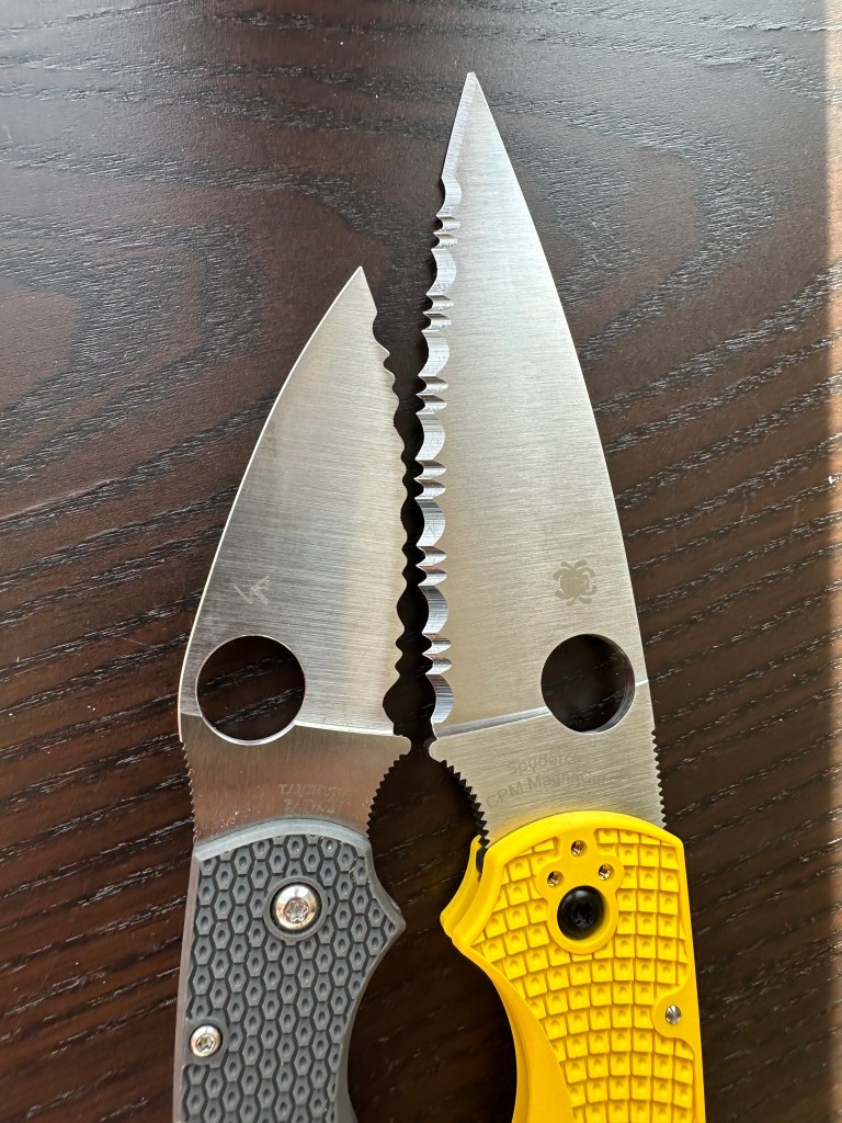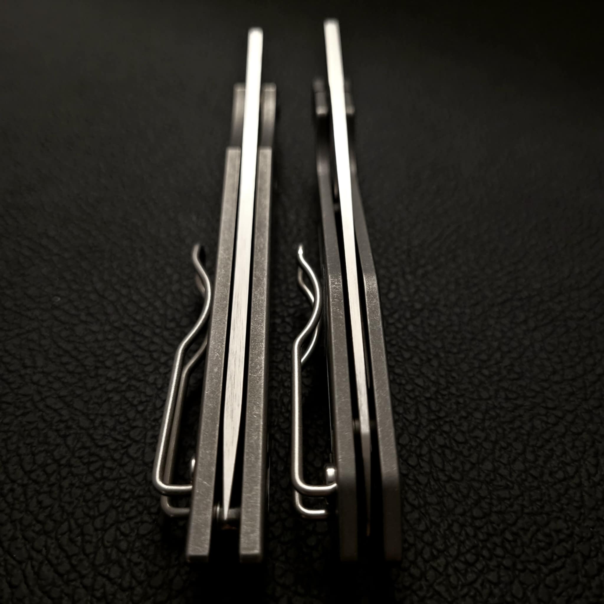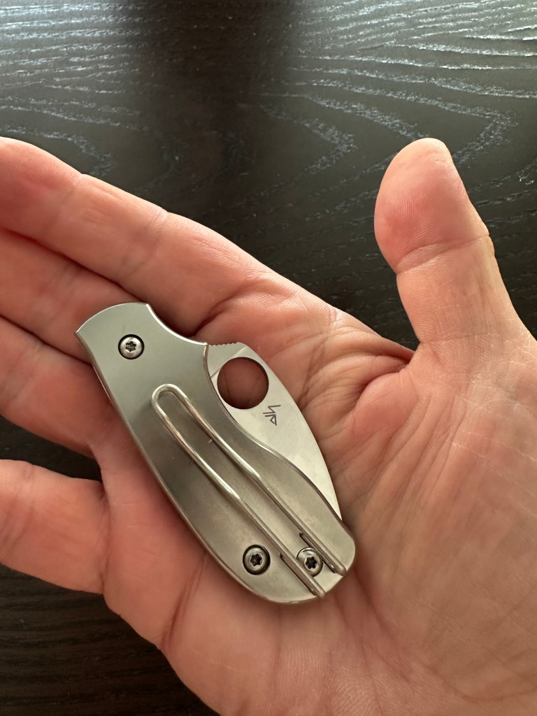 The custom Alien used a titanium clip, whereas the production PITS 2 wears a steel one — but I actually prefer Spyderco’s version here.