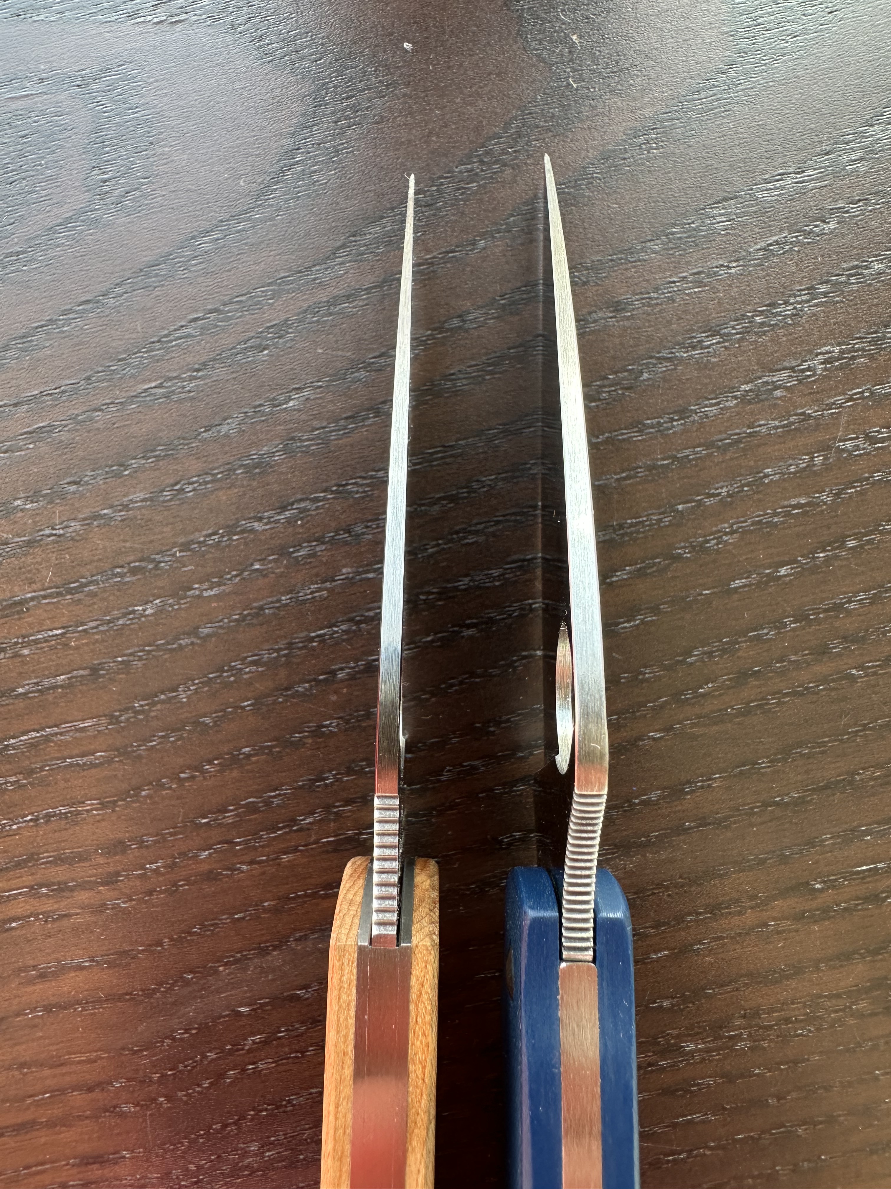 (My Nano has been heavily resharpened into a convex edge, while my PITS2 comes with its thin, perfectly even factory edge.)