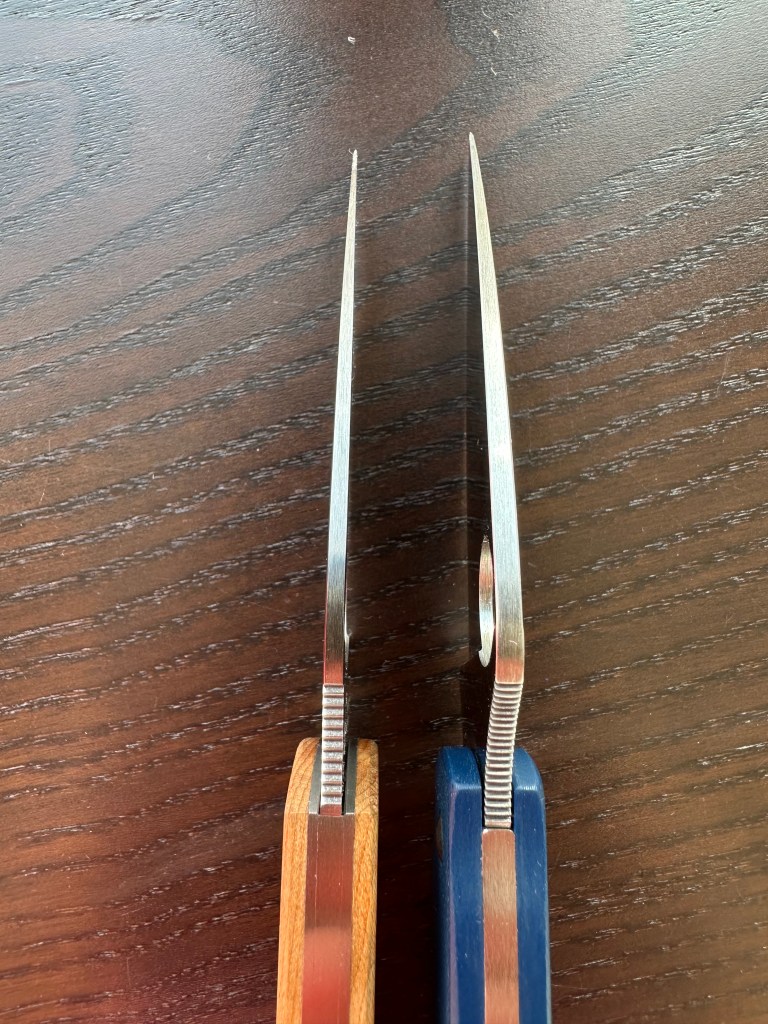 Now, about the mechanics: The Chaparral SLIPIT specifically replaces the usual Chaparral’s back-lock with this “notch-joint” spring system. The Chaparral backlock is also unique in the Spyderco catalog as it get an hidden pin for zero vertical play . Most Spyderco slipjoints close in two stages — first, disengaging the spring tension, then a mid-stop for safety. Not the Chaparral. Once you disengage the spring, the blade flows smoothly all the way to the closed position. (Compare that to the Manly Wasp (pictured in orange) or Comrade, which both have four distinct steps!) That said, disengaging the blade on the Chaparral requires a bit of effort — which is actually a good thing, especially for whittling. Feeling a blade start to close while it’s wedged in wood is never pleasant. I’ve had that experience with the beautiful COBOL, and it’s not something I’d want to repeat. Compared to other SlipIt models, the Chaparral is not in the same range of spring tension. I was initially afraid the action might feel too soft. It is not soft but noticeably less hard than my UKPK, Urban, Squeak or Metropolitan. My strongest being my Heinnie G10 Urban.