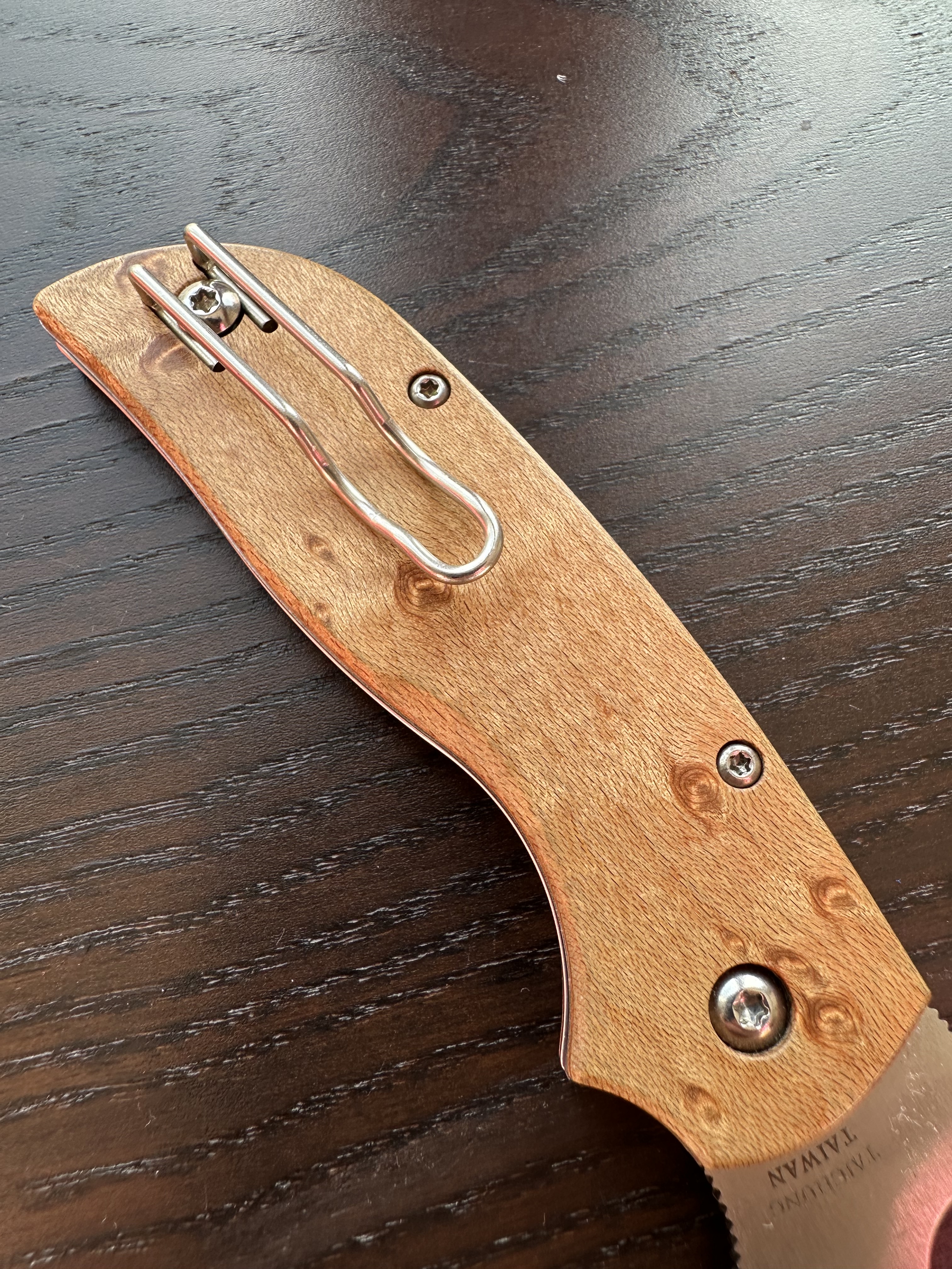 The knife comes with Spyderco’s standard wire clip, but I have swapped it out for the shorter clip used on the MicroJimbo, Lil’ Native, or Dragonfly — it’s more discreet and I wanted to do it before leaving any mark on the wood.