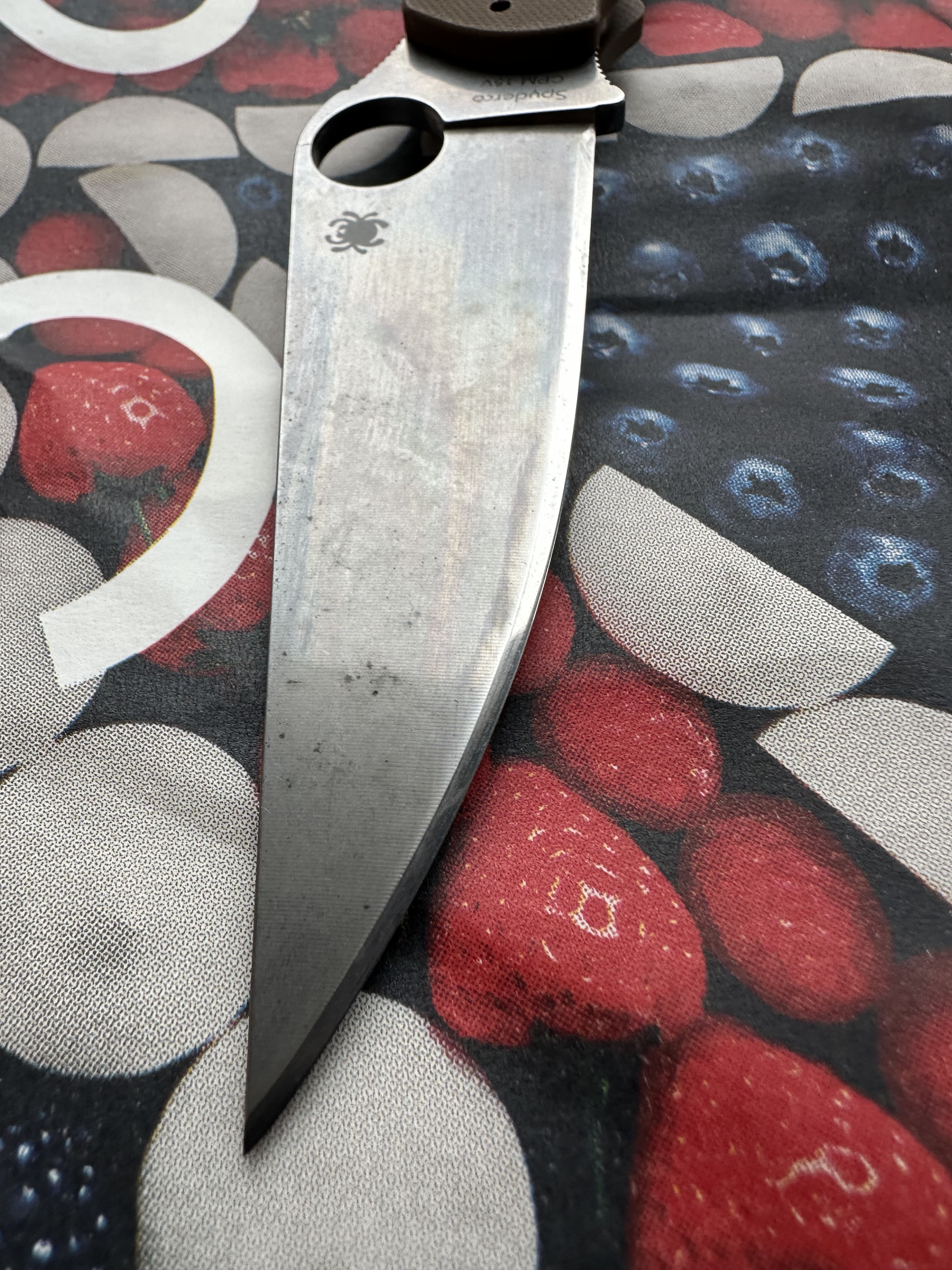Mechanically, this is the first Spyderco I’ve handled that’s harder to open than to close. The blade retention in the closed position is quite strong, while closing is much softer than most slipjoints. With wet hands, I even find it tricky to open — I have to “Spyder-drop” it by holding it by the hole!