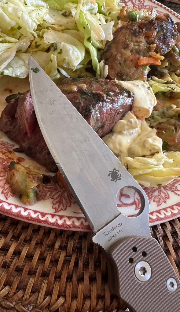 I often use my EDC knives right on the plate. Eating with a sharp blade is non-negotiable — and most of the time, my wife ends up borrowing mine, so it goes back and forth throughout the meal.