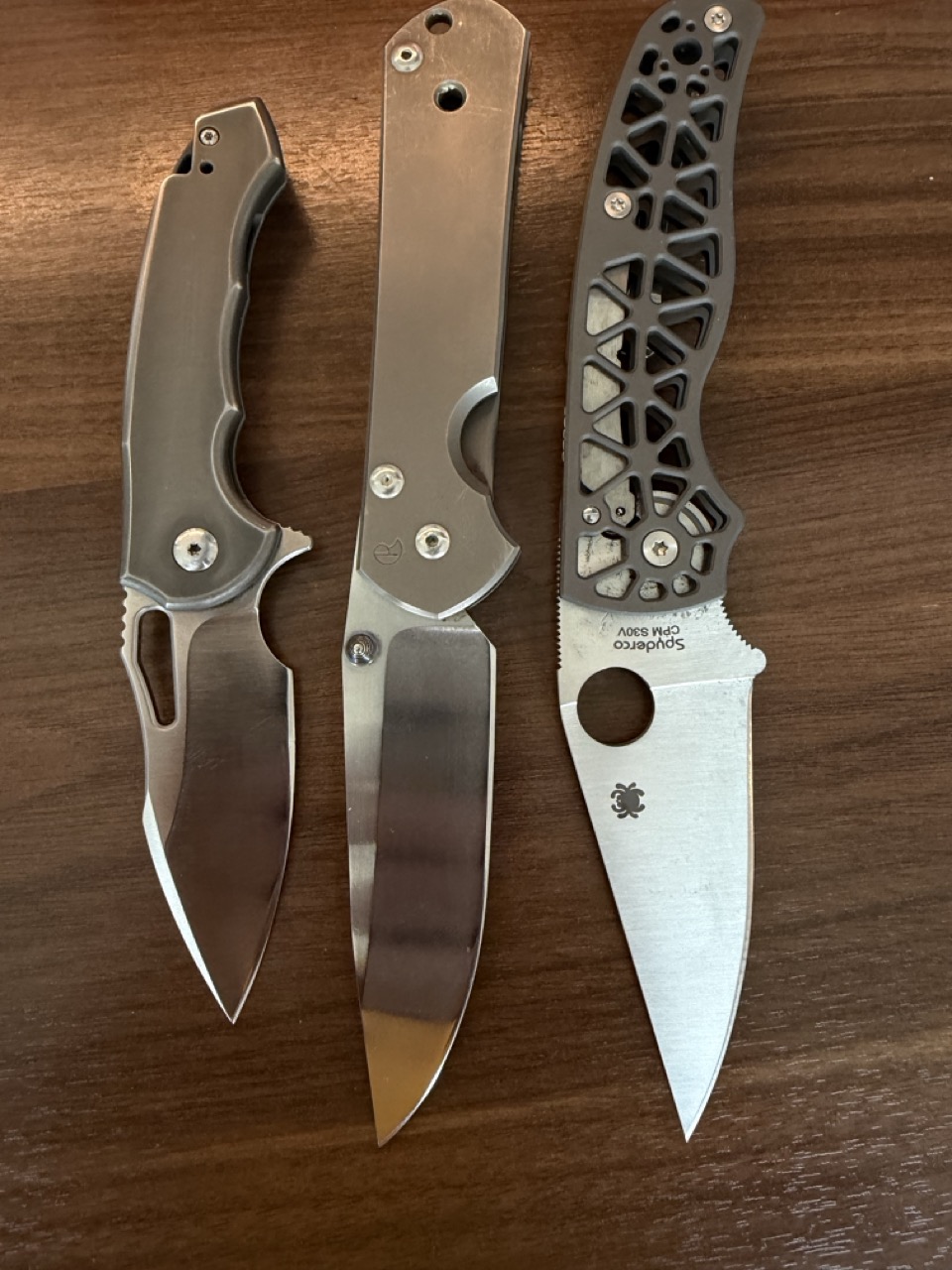 I brought along my 1990s ATS-34 Sebenza and my Falcon to compare the weight and feel of these classic titanium-frame folders against the lightweight, aluminum-framed Edgerati.