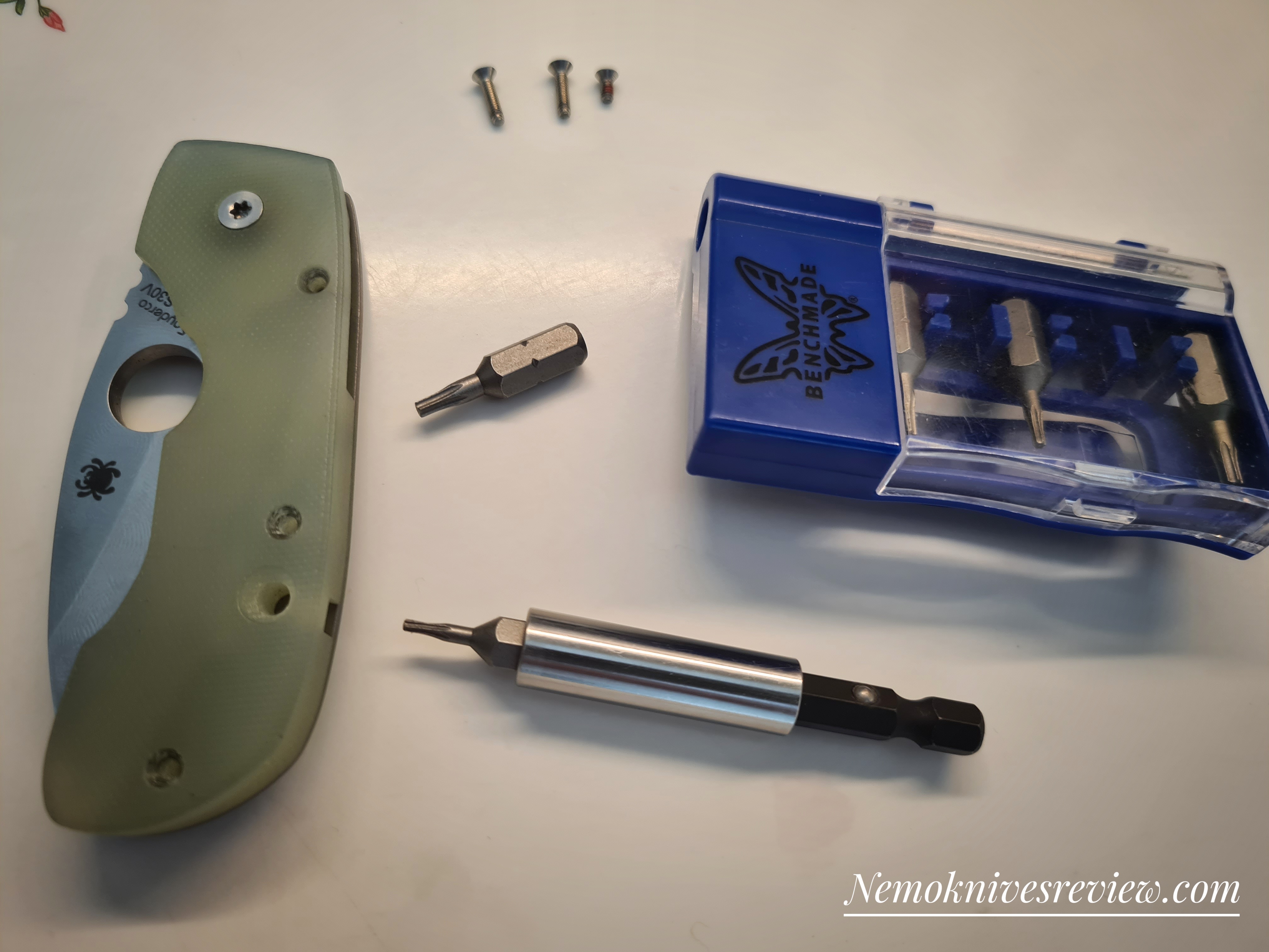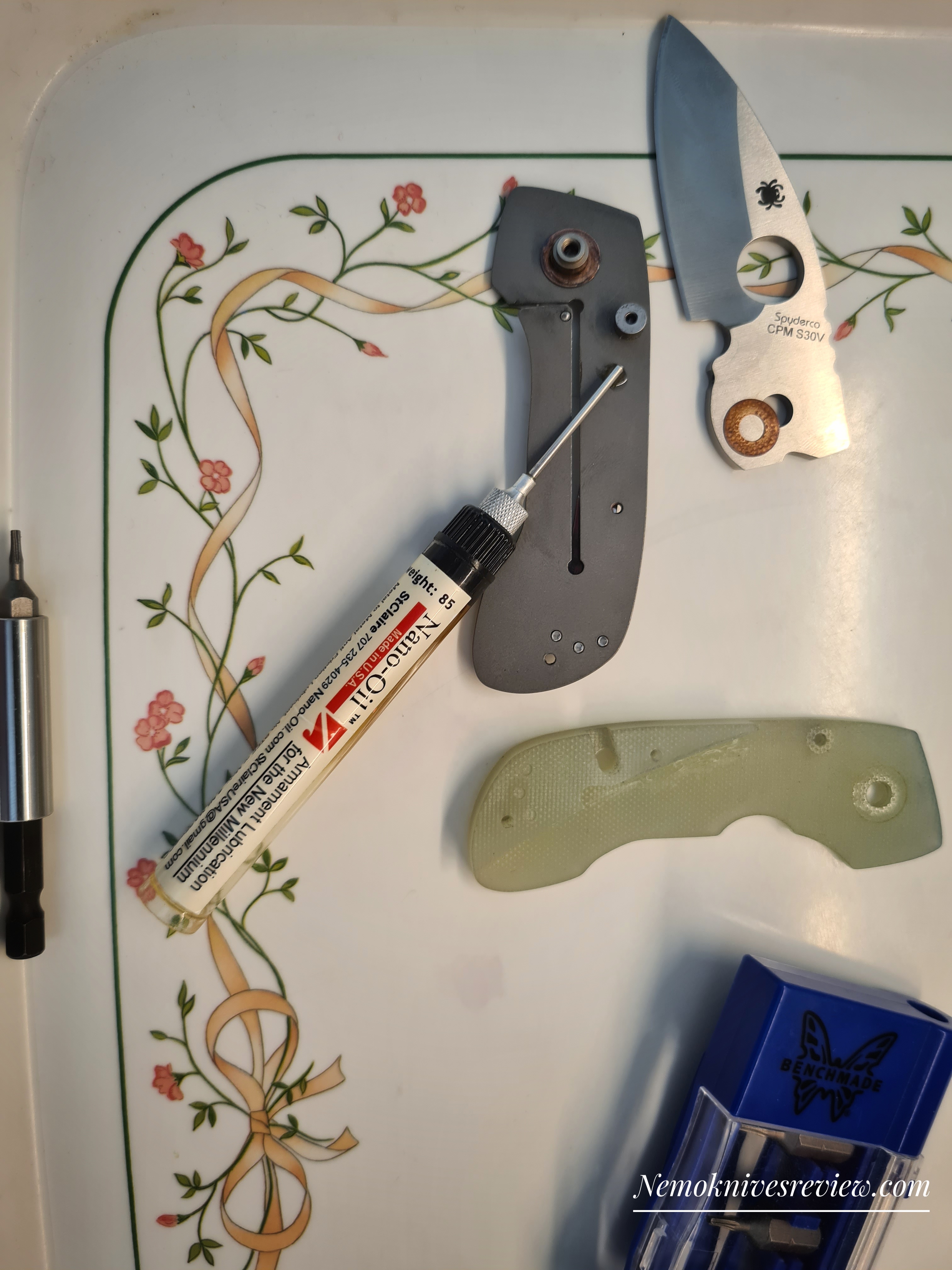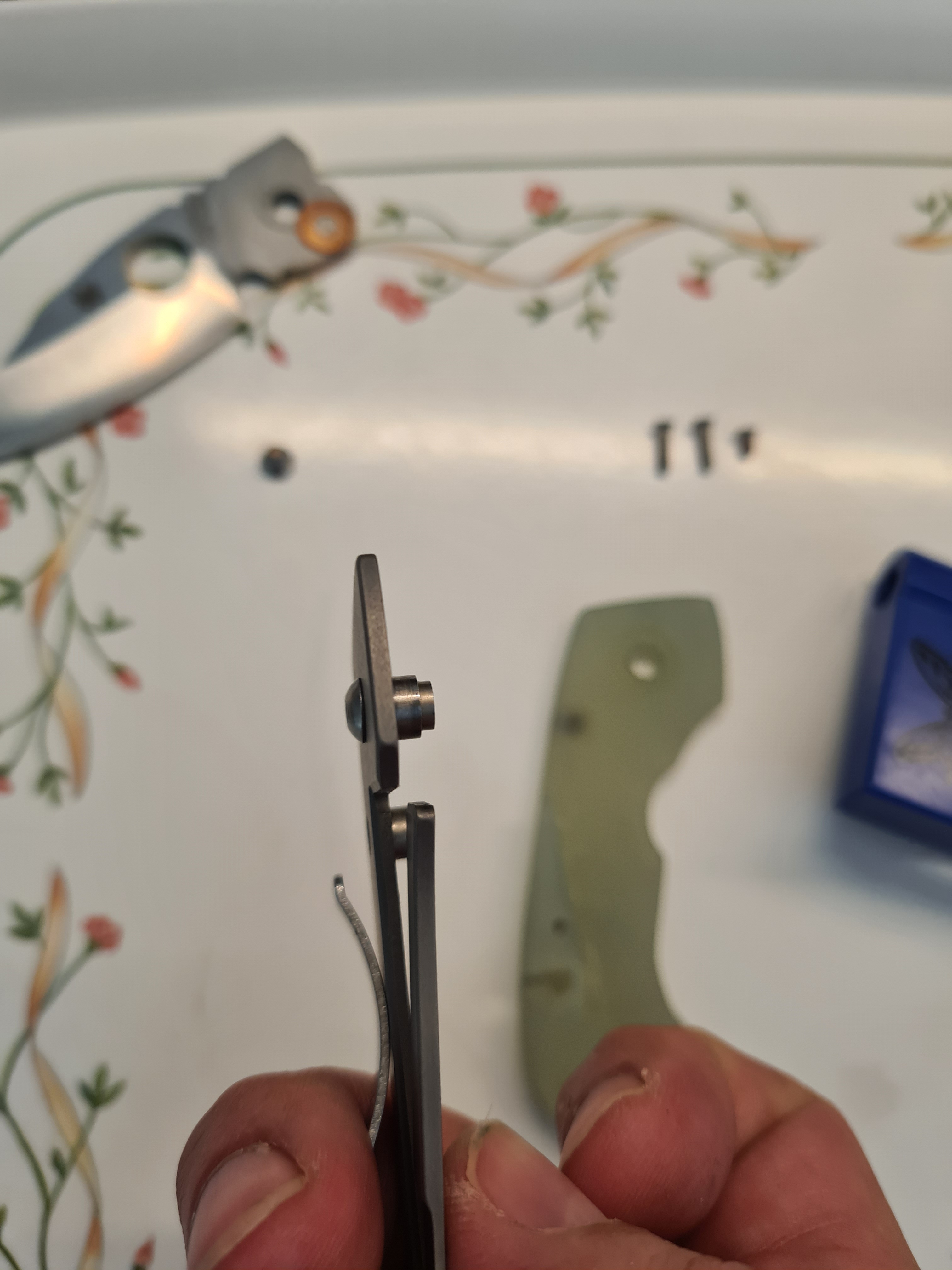 First step: I remove the screws on the G10 side. They are long and goes into the titanium liner on the other side.