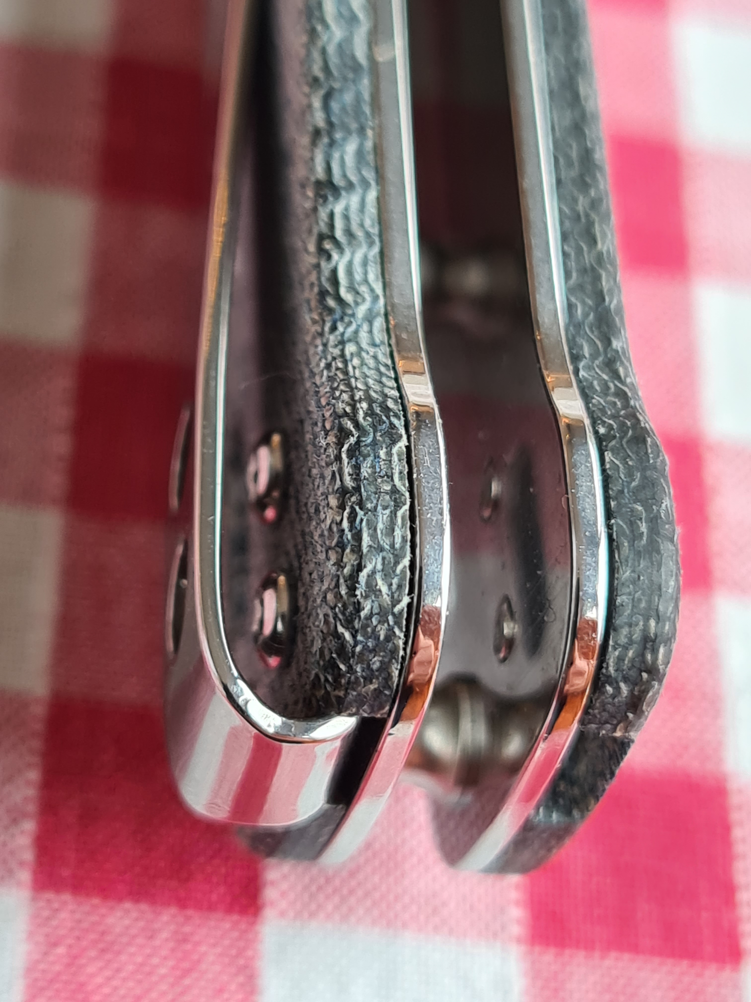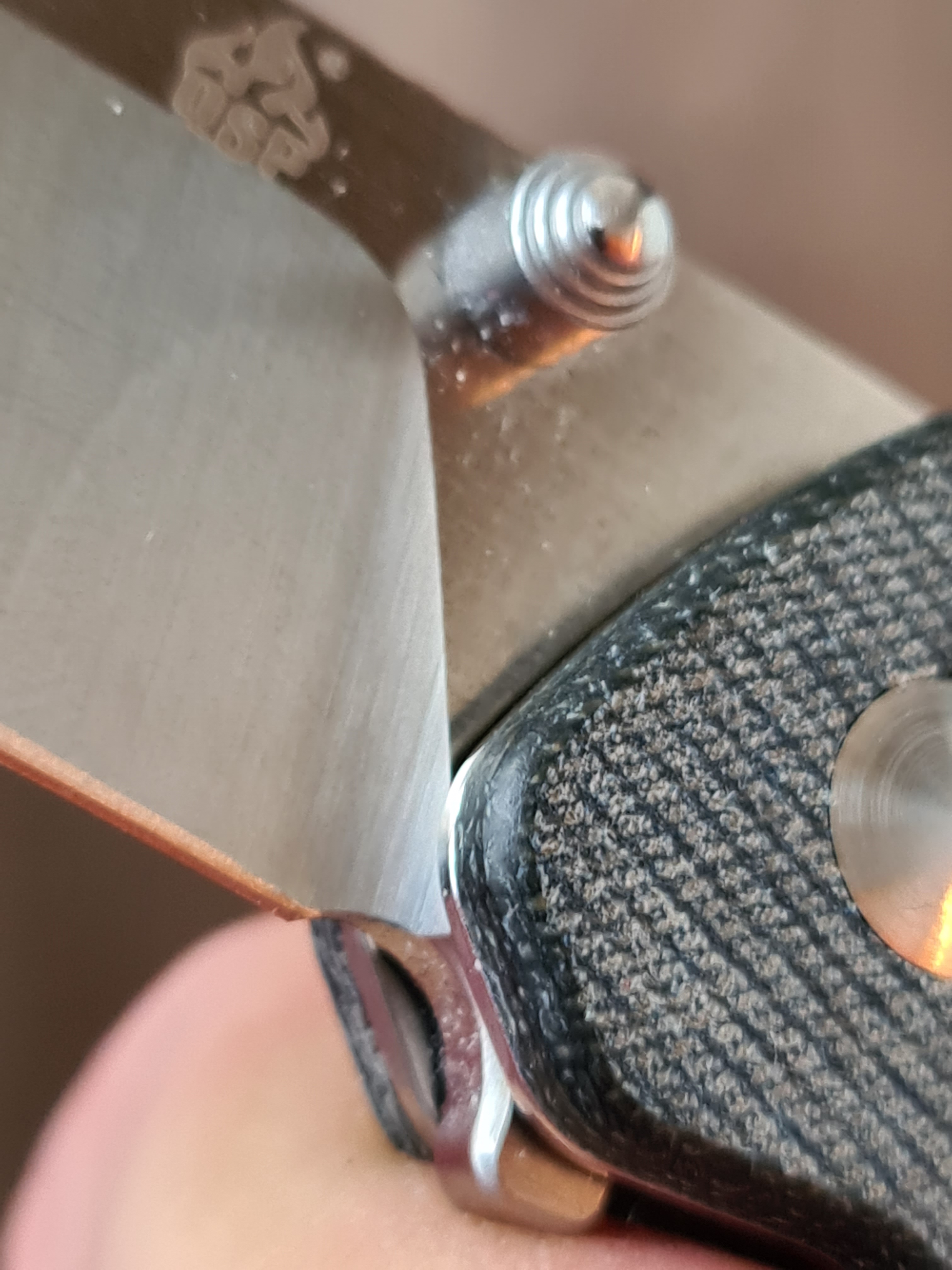 Beautiful micarta slabs, just gritty enough to be pleasant and secure in my hand. Perfectly centered blade. All angled chamfered…