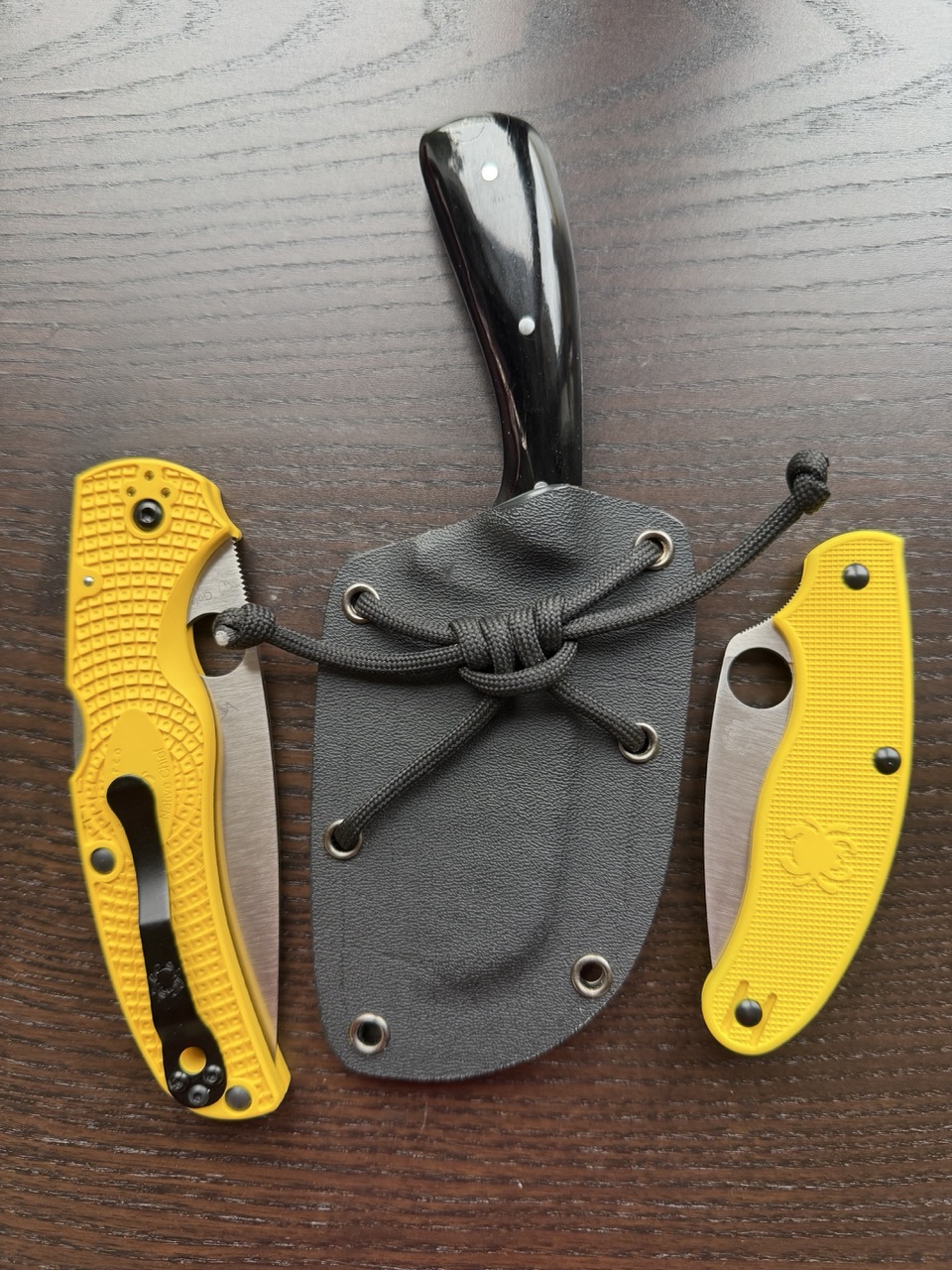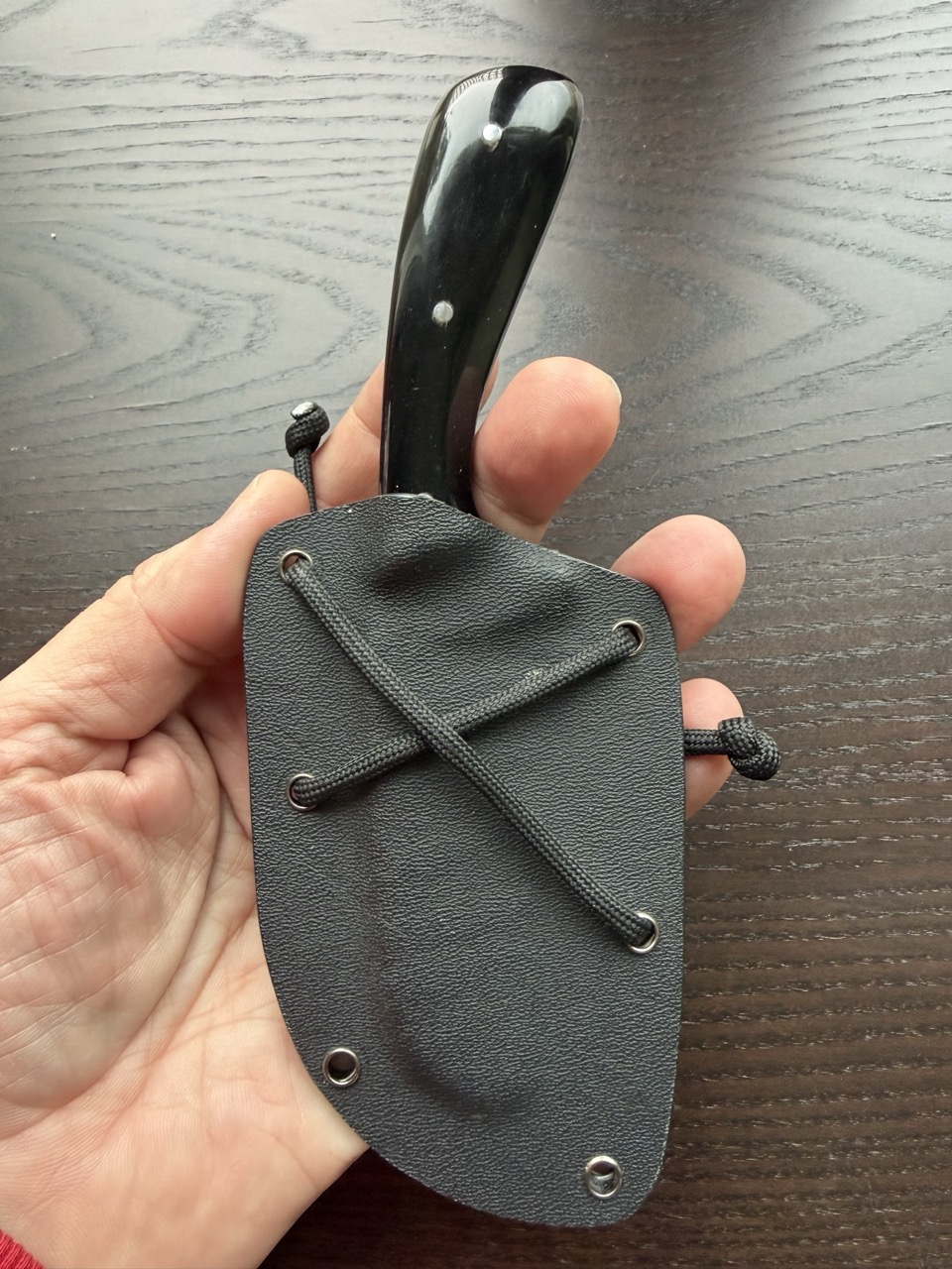 No unnecessary flourish — just a pancake kydex shell, shaped tight to the blade, held by a simple cord system that lets you adapt carry without overthinking it.