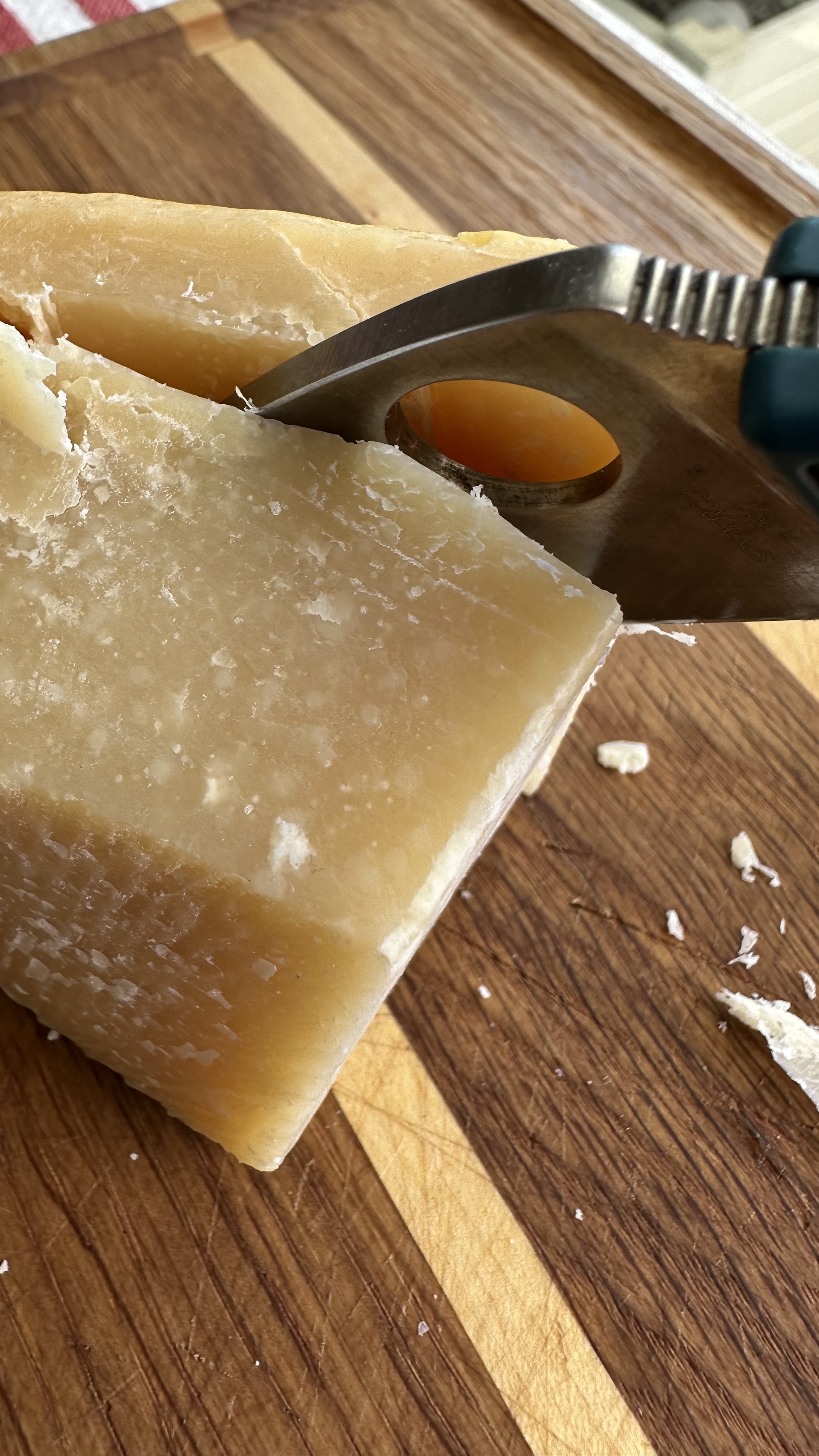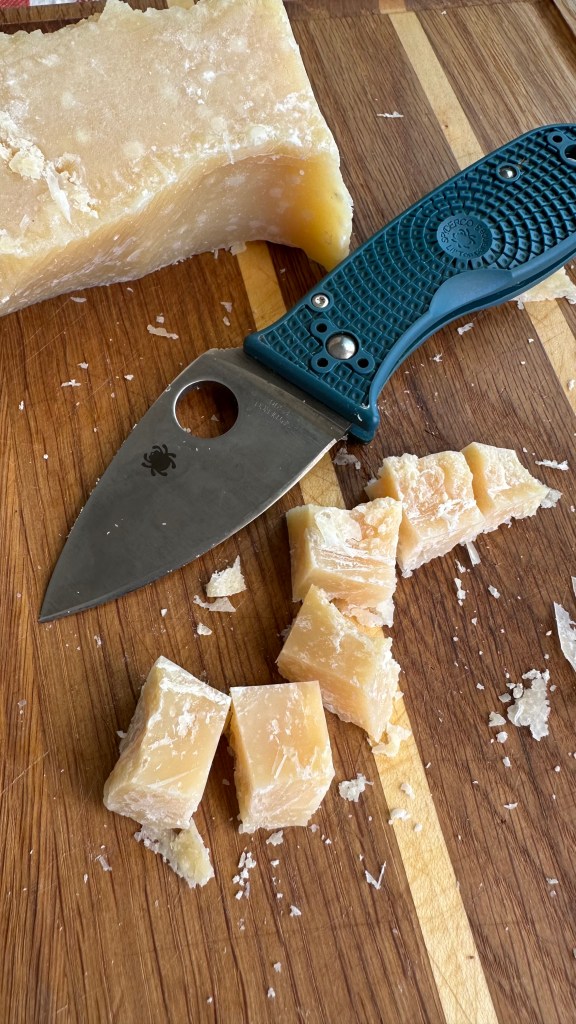 an old chunk of dry Parmigiano which needs to have its rind removed, then cut into half-inch cubes — no easy task given how hard the cheese can be.