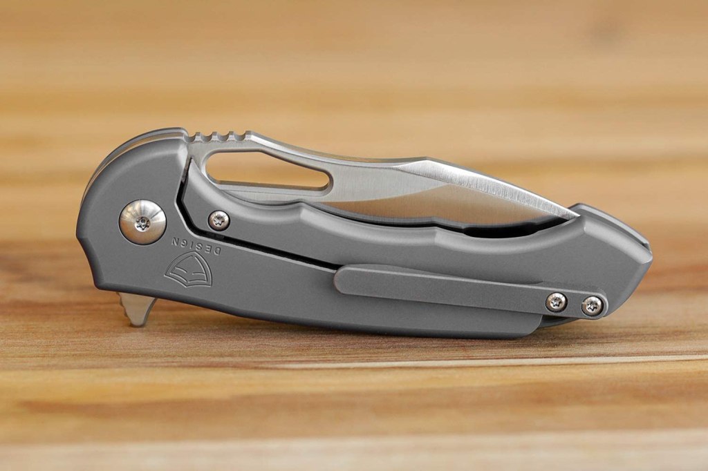 “The Falcon’s 2.9-inch drop-point blade features a sizable choil for index finger placement when choking up. The spine has a concave cutout offering a natural thumb rest for a forward grip. As far as hardware, the Falcon has been crafted with the best materials on the market. Thanks to titanium’s spring properties, it makes for a safe and reliable frame lock that is almost impossible to accidentally disengage. The hardened steel lockbar insert won’t wear out in the long haul, drastically increasing the folder’s longevity. Holding the knife together is a titanium backspacer, bead blasted in gray. Also notable is the titanium clip, which has been adjusted for tension so that it stays put on the go, but it won’t rip your pants apart when taking out the knife.”