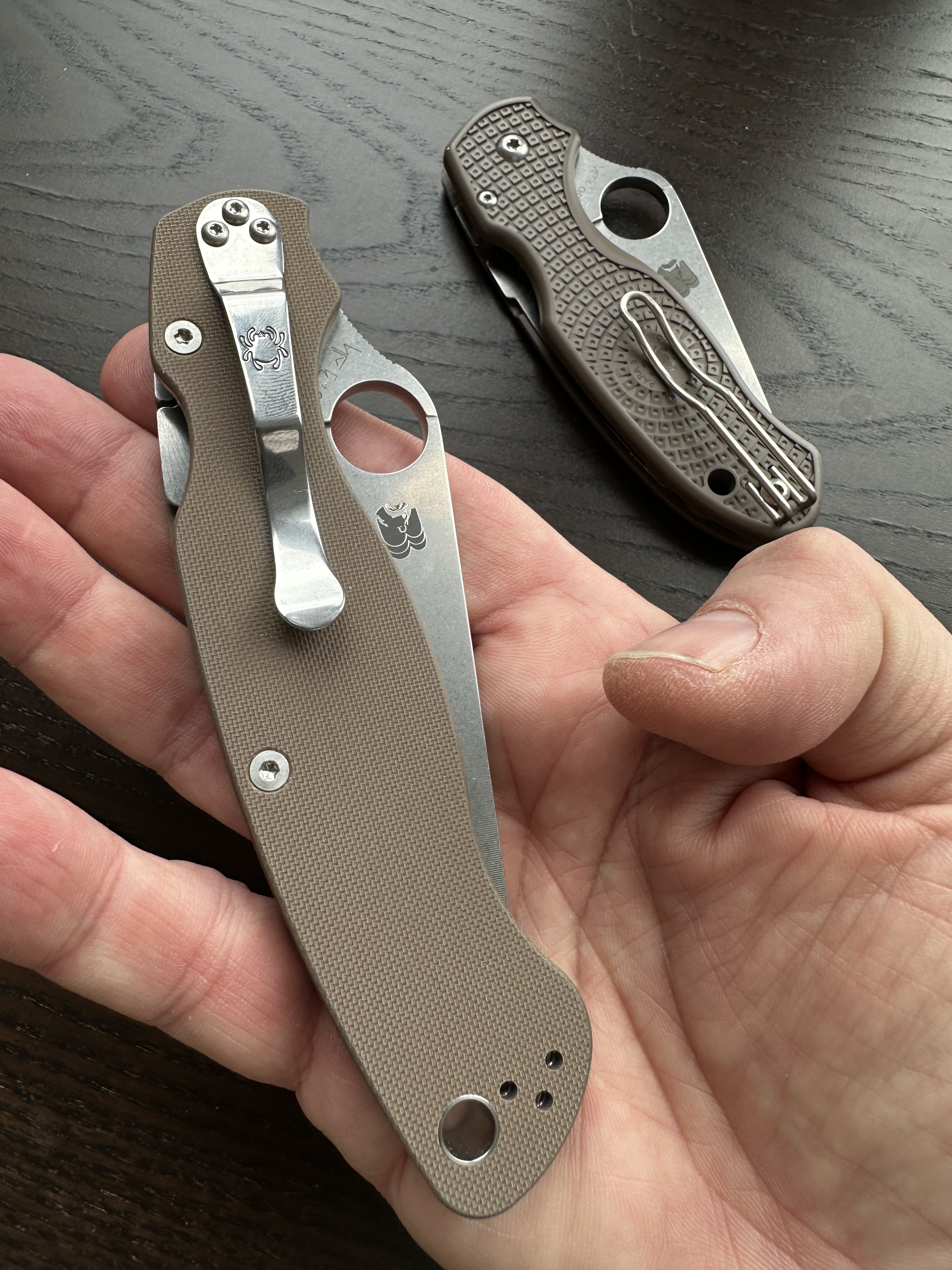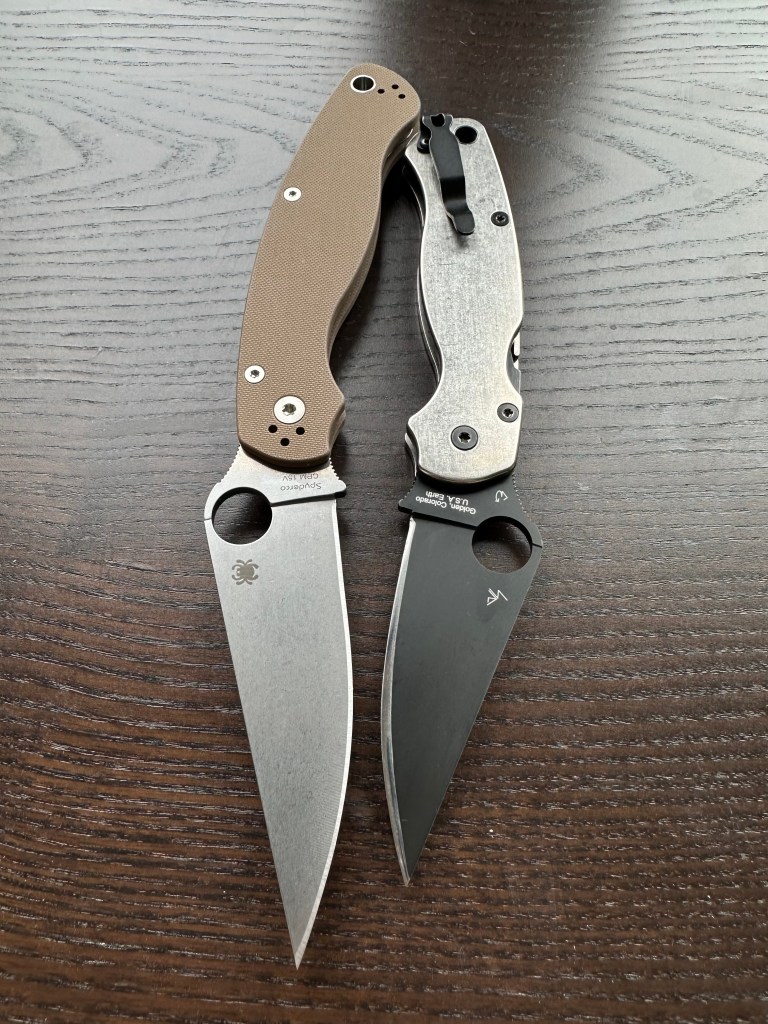 The comparison between the Sage 5 Salt and the Para 3 continues. In short: the Sage 5 has superior geometry thanks to its high 3 mm FFG blade, while the Para 3 features a sturdier blade, a thinner point, and is overall lighter (no steel liners).
