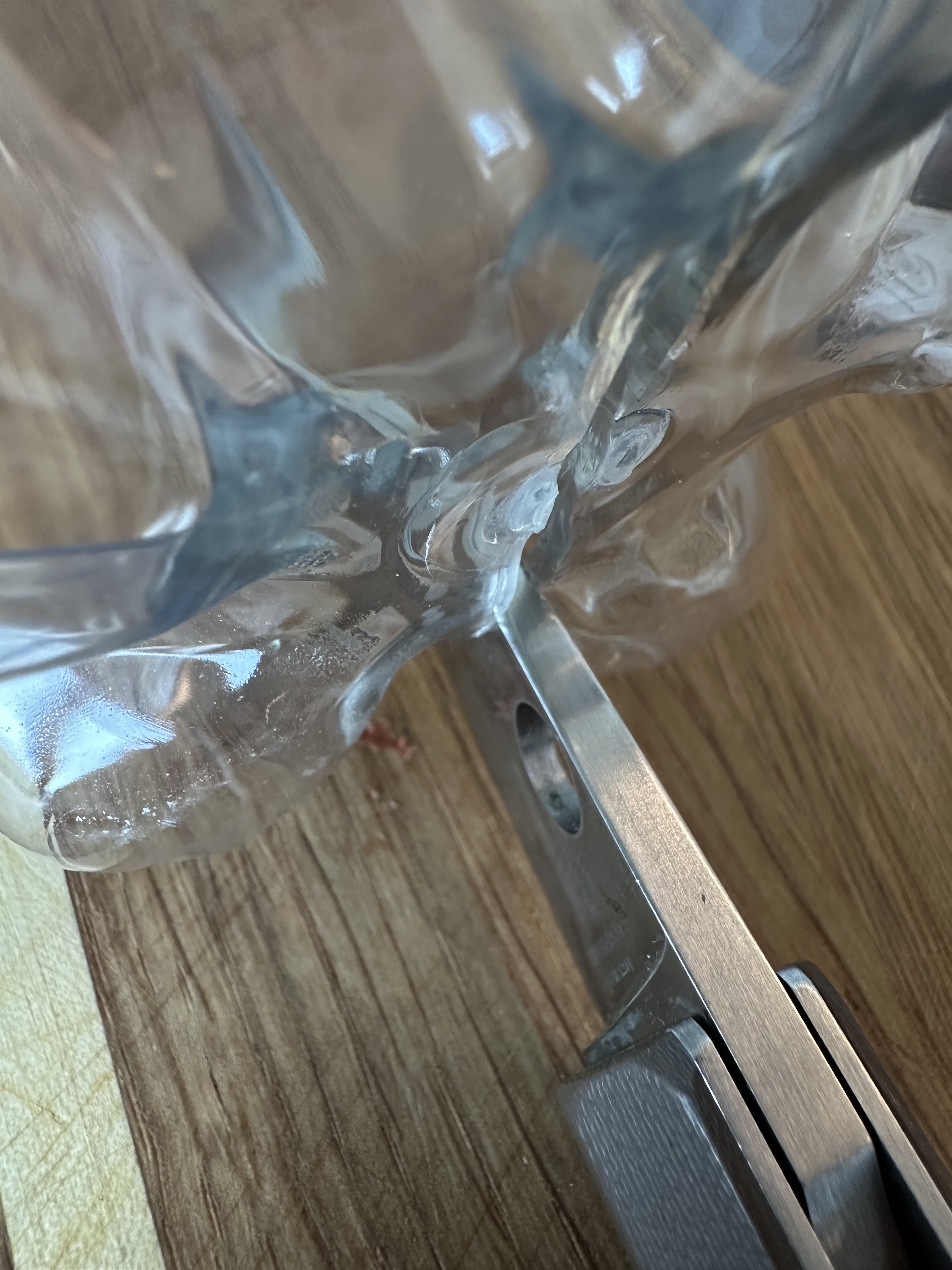 Now I need to convex the edge a little. The blade cannot go through the plastic bottle’s butt.