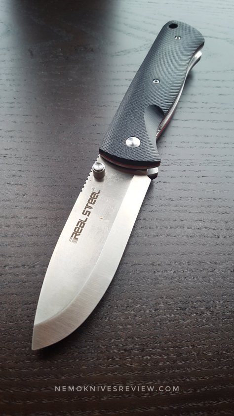 My wonderful Wolfspyder is dwarfed by the heavy RealSteel folder which’s size is very close to any classical bushcraft fixed blade. You feel you can easily use it for light chopping, for finishing off a cut. Again, impacts are not folding knives’ best friends, but the momentum of that heavy blade could be used for light chopping in wood, like trimming branches in one whip of the wrist.