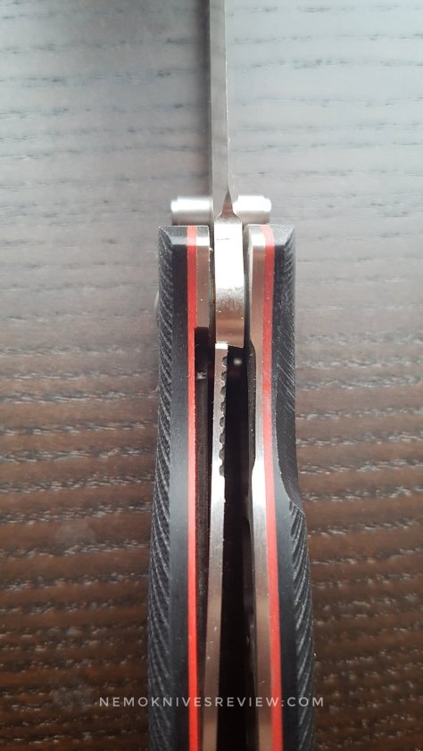 The G10 has got a very nice texture: not harsh. You can notice it on the picture. Also there is no hot spot on that handle so you can hold it really tight; it’s almost like a fixed blade. The linerlock is recessed and you can not disengage it by holding tight the handle. Just be careful and always remember: regardless how strong a folder is, it will never be as strong as fixed blade. Use it with respect and care; should the lock fail, there is no choil to protect your precious fingers!