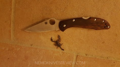 Again, S30V as heat-treated by Spyderco has proven to be a great “all terrain” steel as its edge was not dulled a bit. I’m surprised about the way it kept a perfect edge after all the cuts in a dirty bark and hard wood. Hairs were still flying of my arm. (I heard so much about it losing that very sharp fine edge beause of its relatively big carbids…). It will not be the was with…