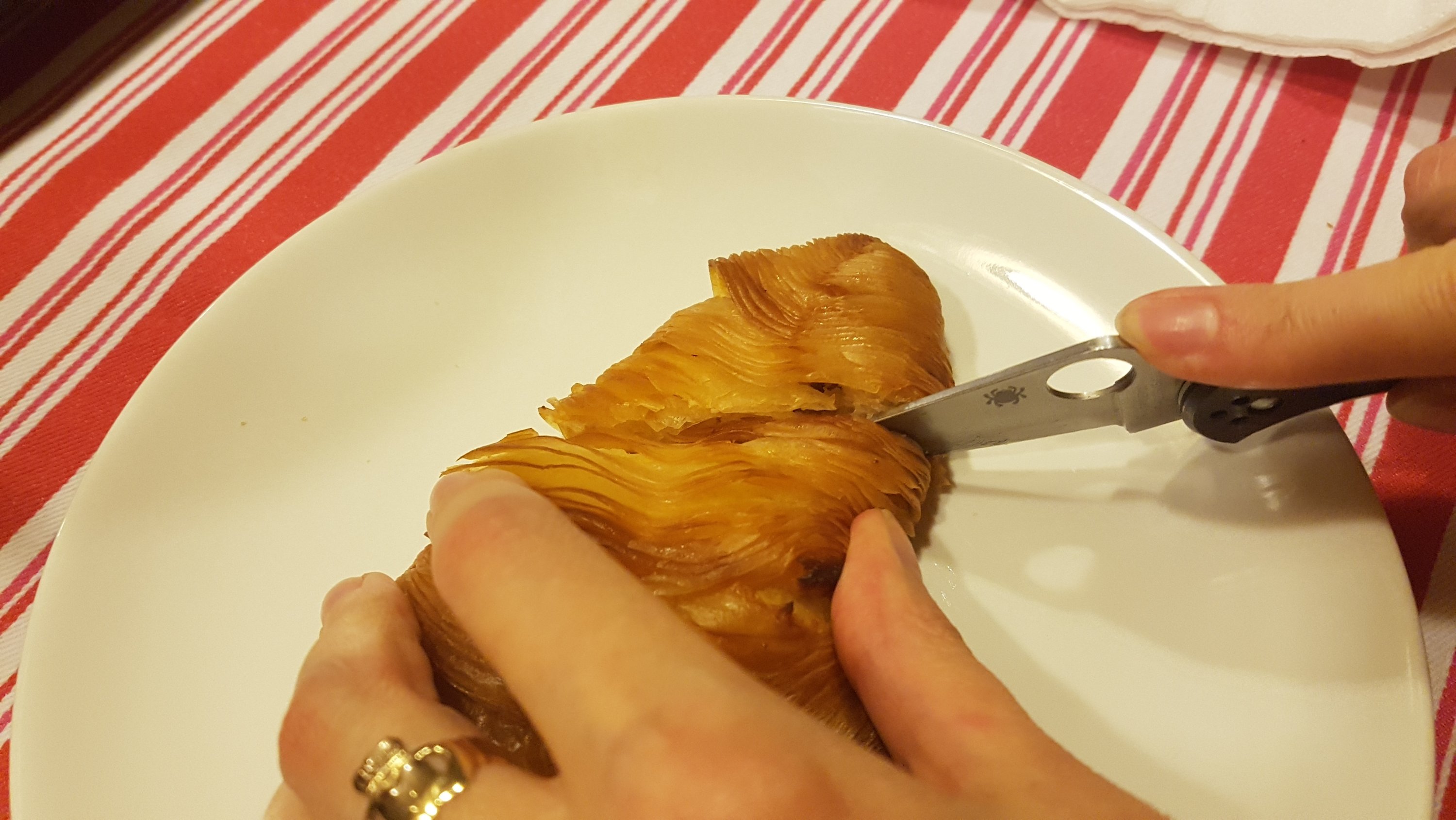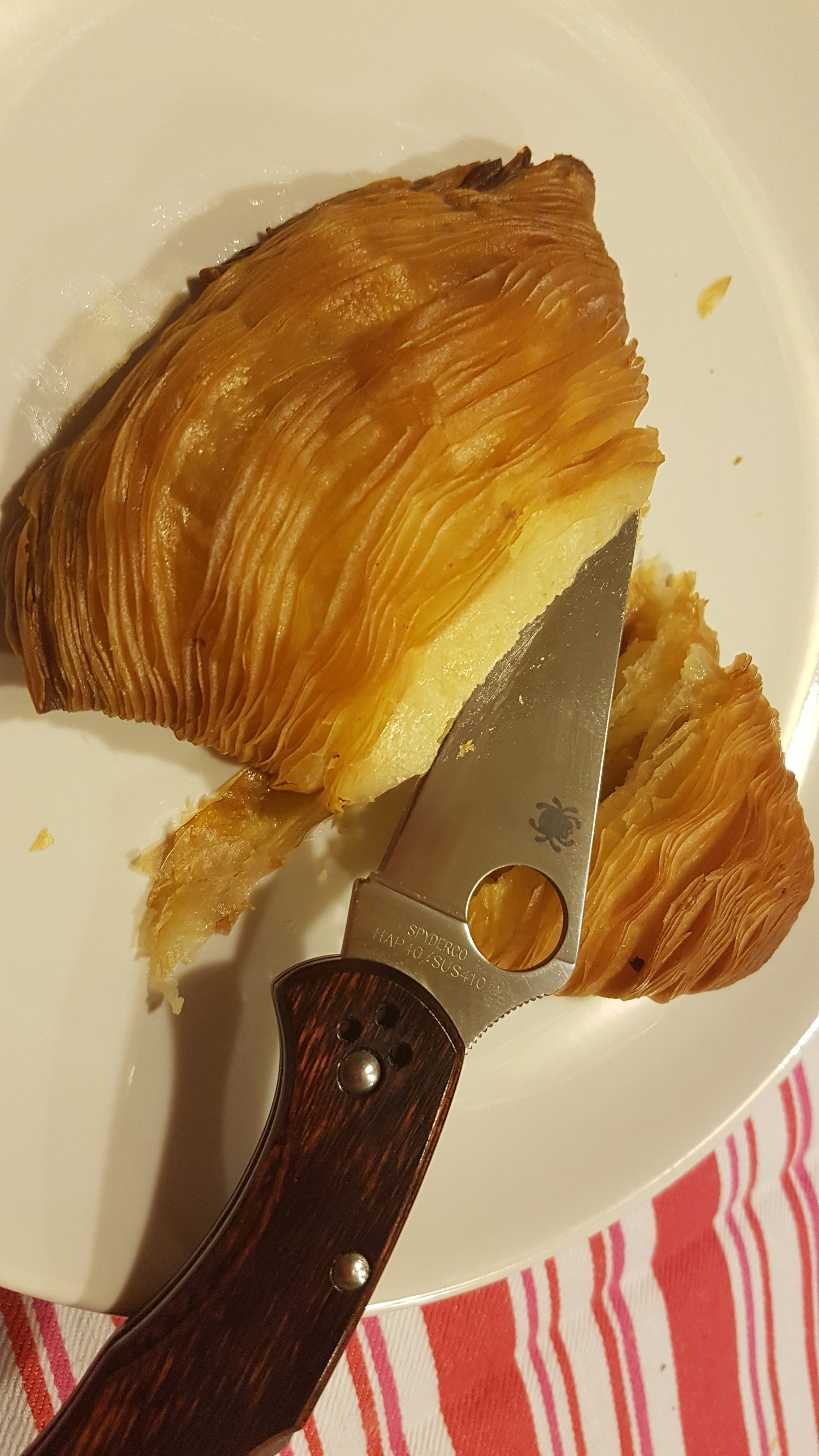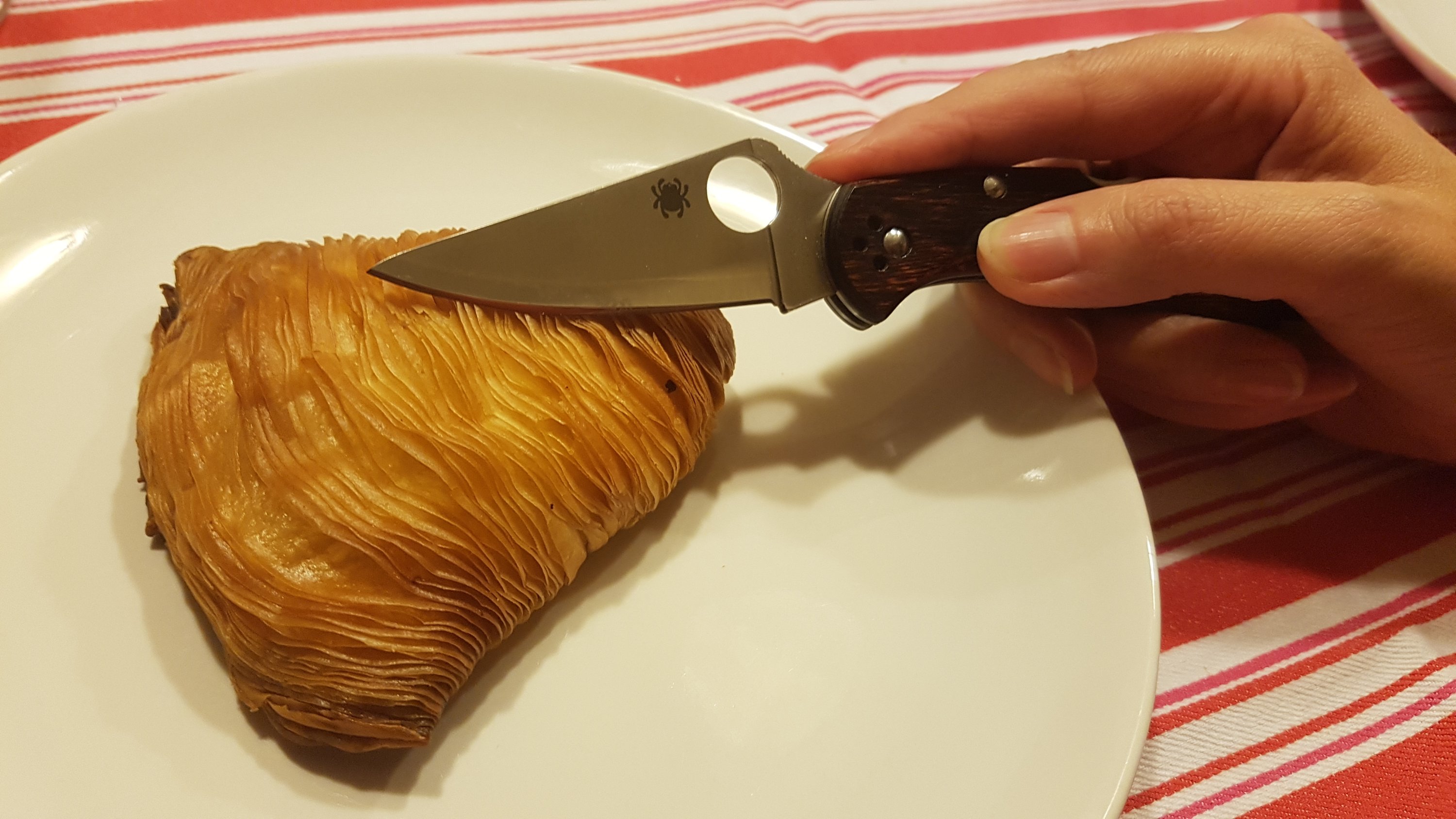 Hard crust and soft inside. You need a very thin edge to cut all those blades of pasta’