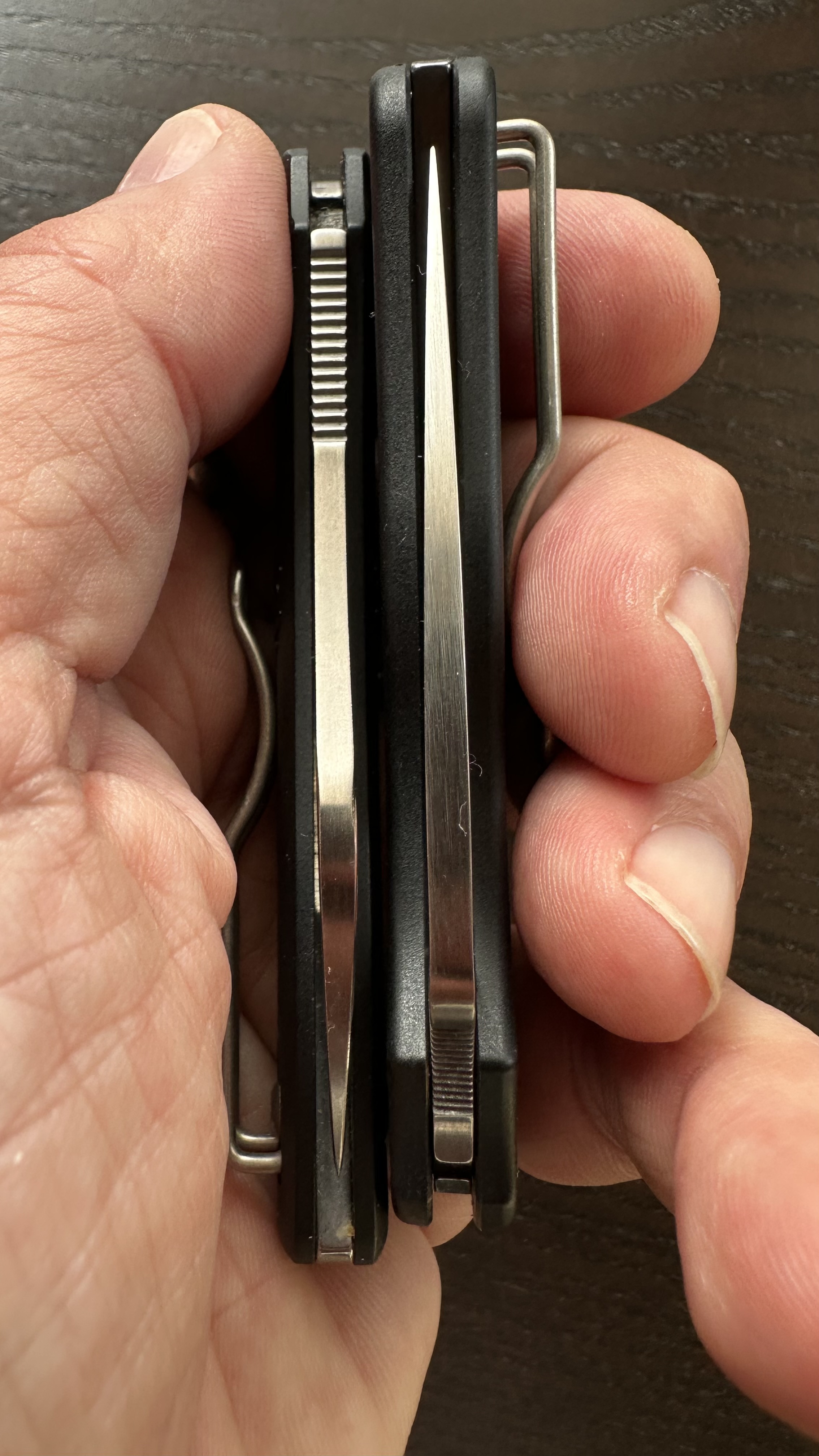 That lightweight Chief strong mid-backlock mechanism is impressive: no liners or spacers and… zero play (unlike my CPM-4V G10 Native Chief, which had slight vertical play.), and perfect action. The blade falls gently when unlocked, The drop-shut action is smooth, supported by a very strong spring, and the knife oozes quality from every angle.
