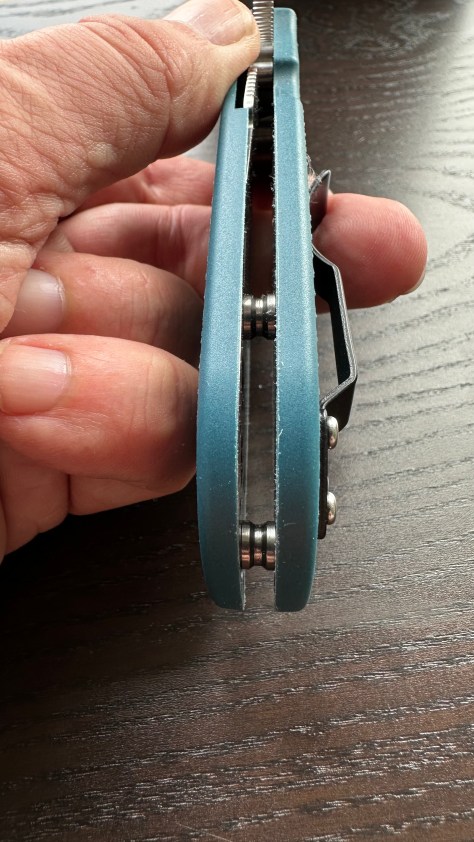 That thumb ramp is wide and a perfect comfy spot for your thumb or for that tender web skin between the thumb and the index finger. The action is smooth but as smooth as the Sage5 or the Millie 2. No vertical play. No pinching. Drop chute after a little wrist flick. The opening arc is a little wider on this one due to the placement of the hole a little far from the axis but the Spyderflick is easily done. It is fidget pleasant folder ! I don’t think it is good for tip down carry and “spyderdrops” as the guard is a little to wide. But for tip up carry and middle finger’s flips, it is perfect. The relatively thick handle is really comfy even when squeezed. So far I have not find any hot spot. I will certainly sand the edge off the FRN but nothing is really needed, it is just my taste in smoothing everything.