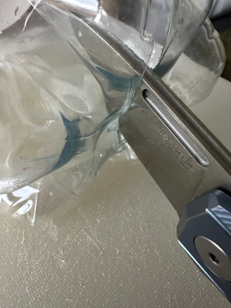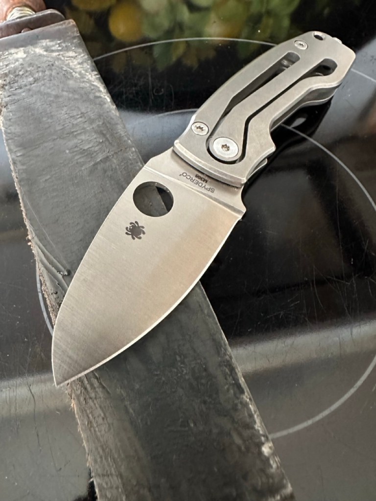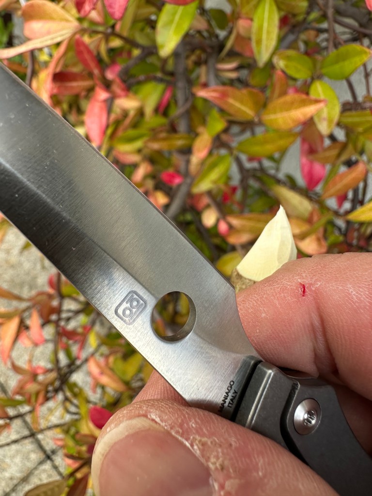 And, as I mentioned in the quick first‑look, that relatively tall blade comes with very thin geometry. This is the first Spyderco edge in a very long time—aside from my Chaparrals—that didn’t need to be convexed. I usually “de‑shoulder” everything to my taste and to my standard test: the plastic bottle butt.
