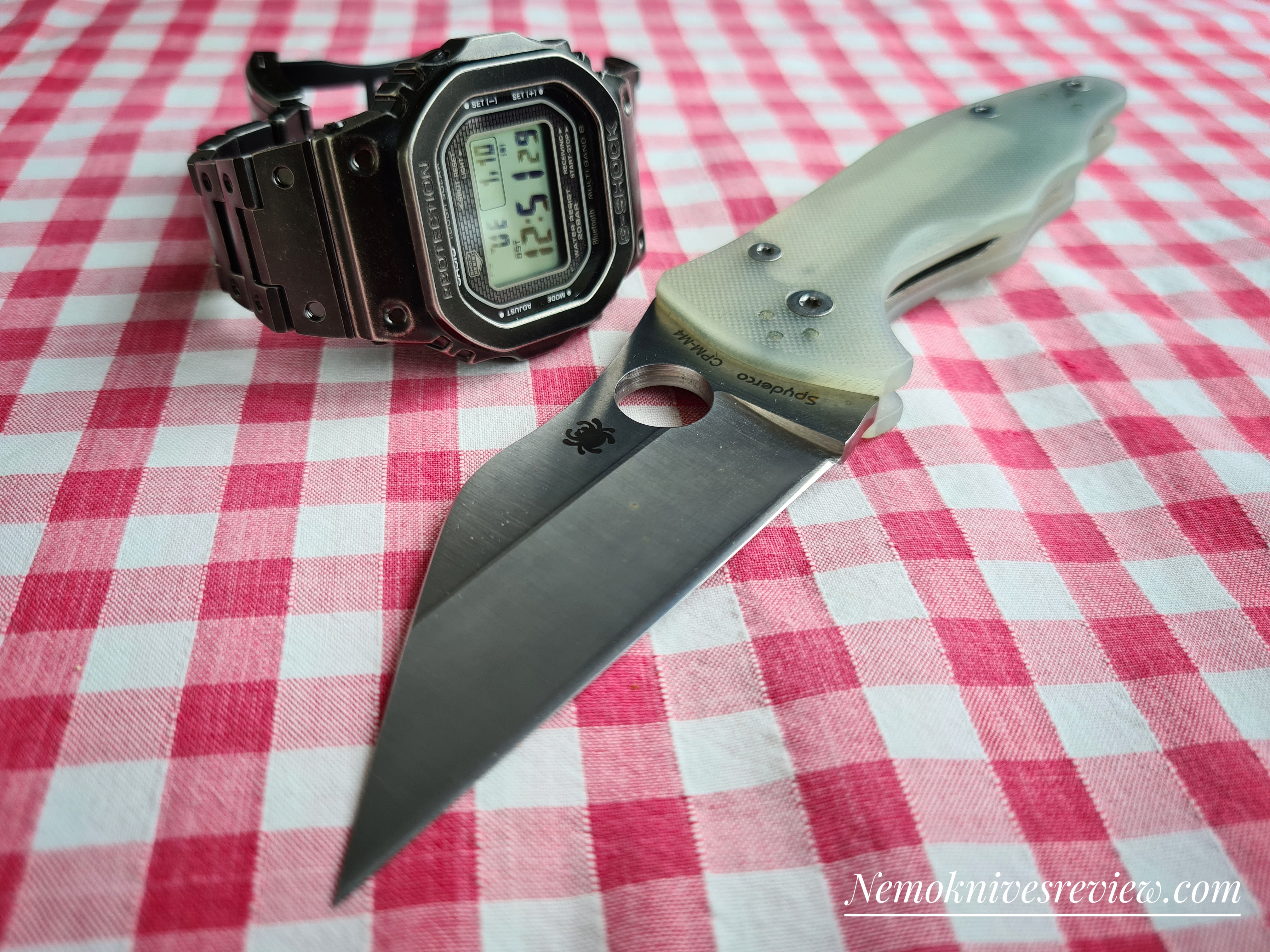 “When I designed the blade for the Yo2, I took a lot of inspiration from the Manix2, both because I like the way it cuts and because, as a Golden-made product, its manufacture respresented a known core competency for Spyderco. Combining a partial hollow grind with a thick, strong spine provides a great balance of edge geometry and strength. Moving the point up towards the blade’s centerline moves it toward the thicker part of the blade; however, if the hollow grind runs parallel to the edge all the way to the point, the resulting point thickness is functionally the same as what you get with a wharncliffe.